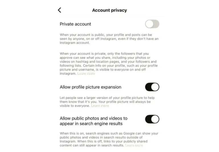 In your Instagram account privacy settings you’ll find a toggle that says ‘Allow public photos and videos to appear in search engine results’. Simply click the button and you’re good to go. But before you make this decision, it’s worth knowing the benefits this update can have for your business.